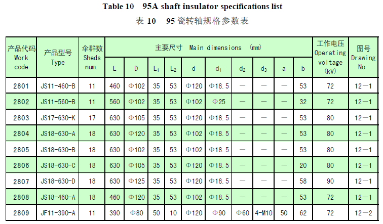 95A shaft insulator can be used under the temperature ≤600℃ with the operating voltage ranging from 72kV to 120kV and a torque failing load not less than 4kN·m.