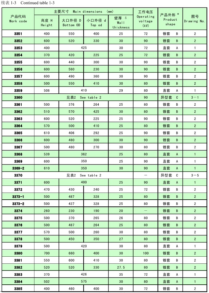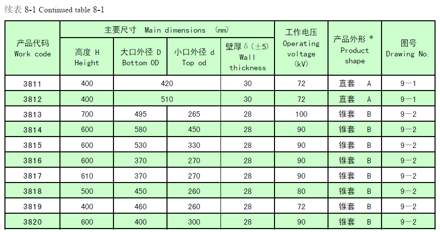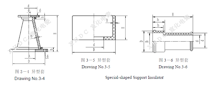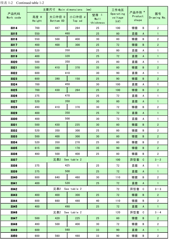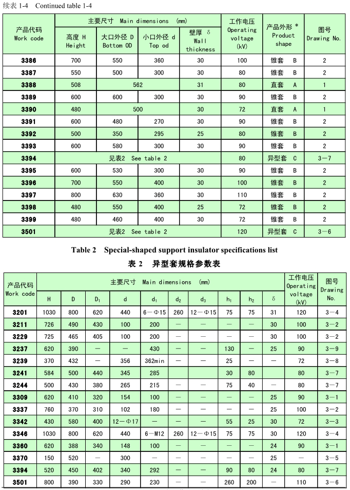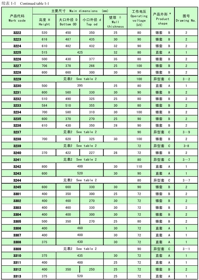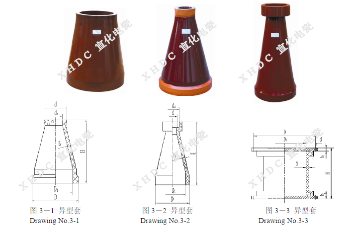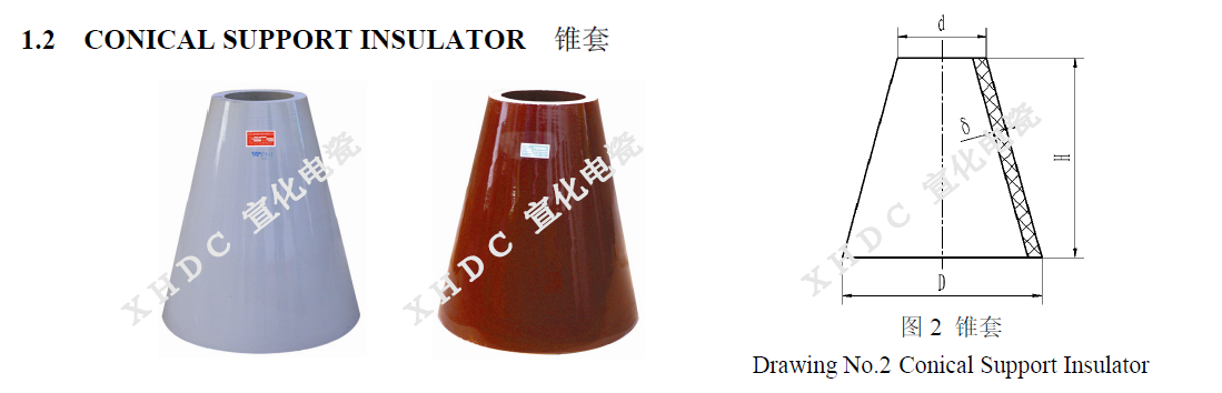 支承瓷套絕緣子(簡稱支承瓷套)用于電暈極懸掛框架吊桿穿過場殼體處的密封和高壓絕緣。根據產品外形特征分為直套、錐套和異型套三類。