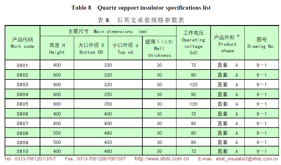 石英支承套的使用溫度為≤500℃,工作電壓為 72~120kV,抗壓破壞負荷不低于300kN。